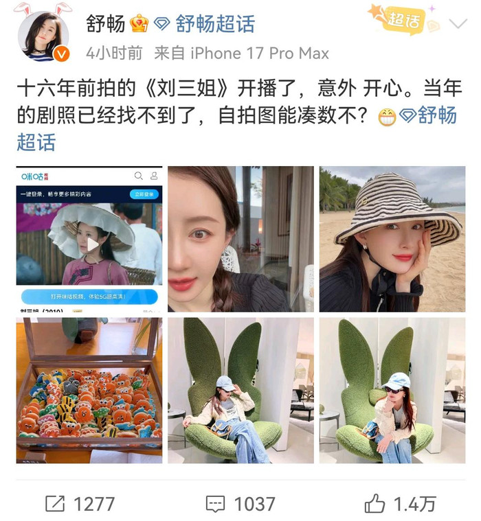“十六年前拍的《刘三姐》开播了,意外,开心。当年的剧照已经找不到了,自拍图能凑数不?”在《刘三姐》播出后,主演舒畅也发文祝贺。公开资料显示,该剧于2010年7月在广西柳州开机,同年9月杀青,至今已经积压了16年。